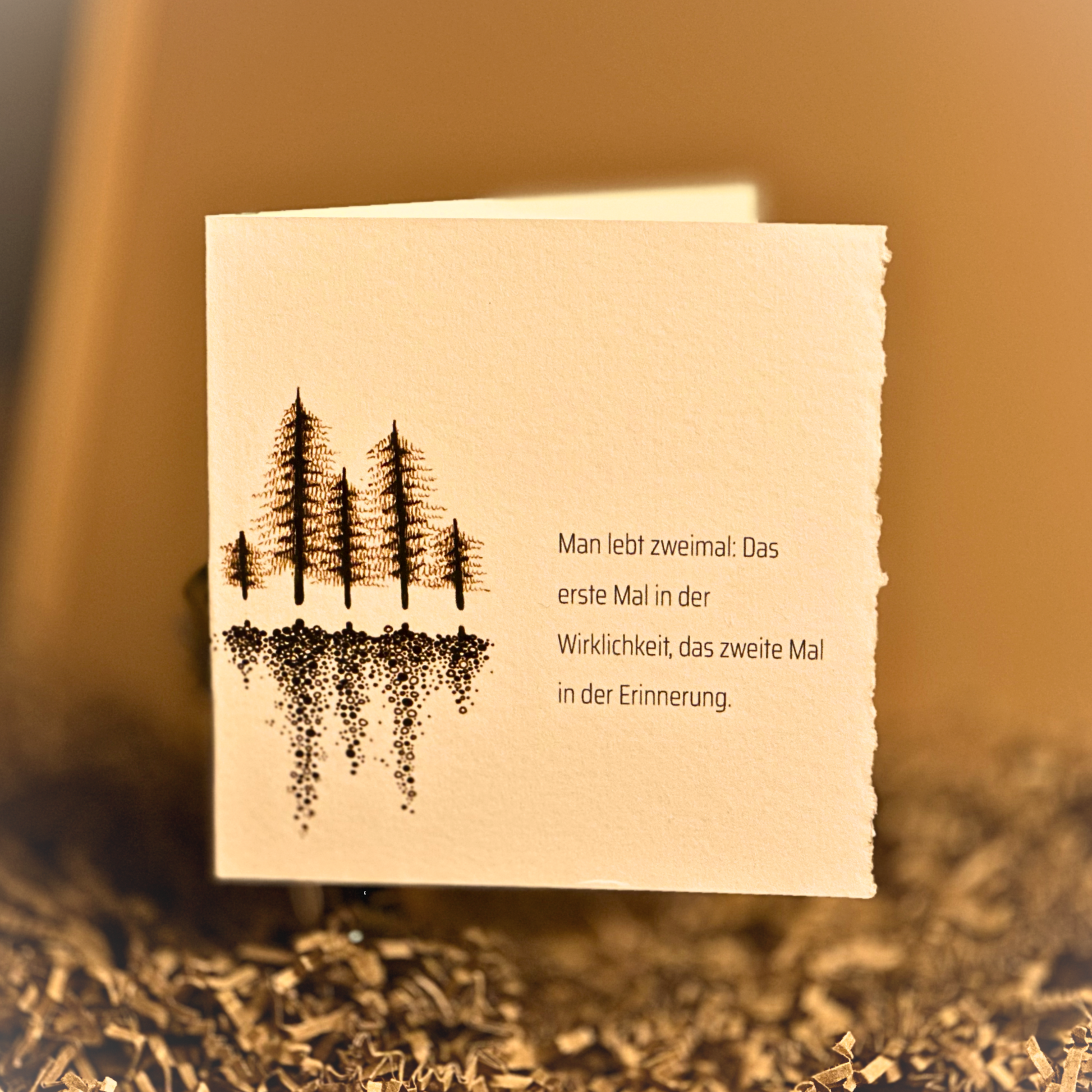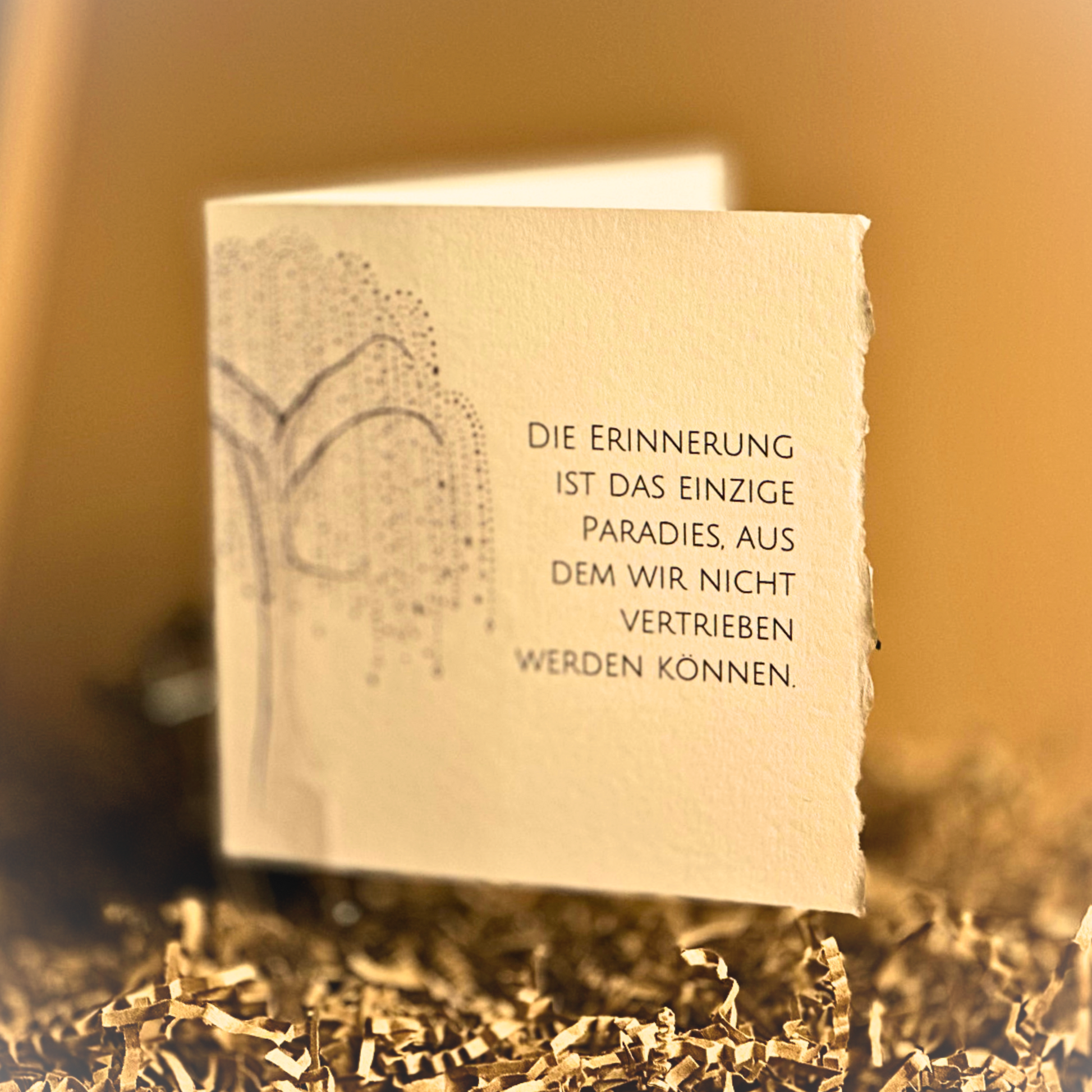 Trostkarten mit fünf exklusiven Motiven stehen zur Auswahl und bieten Platz für eine persönliche Botschaft an den/ die Trauernden.