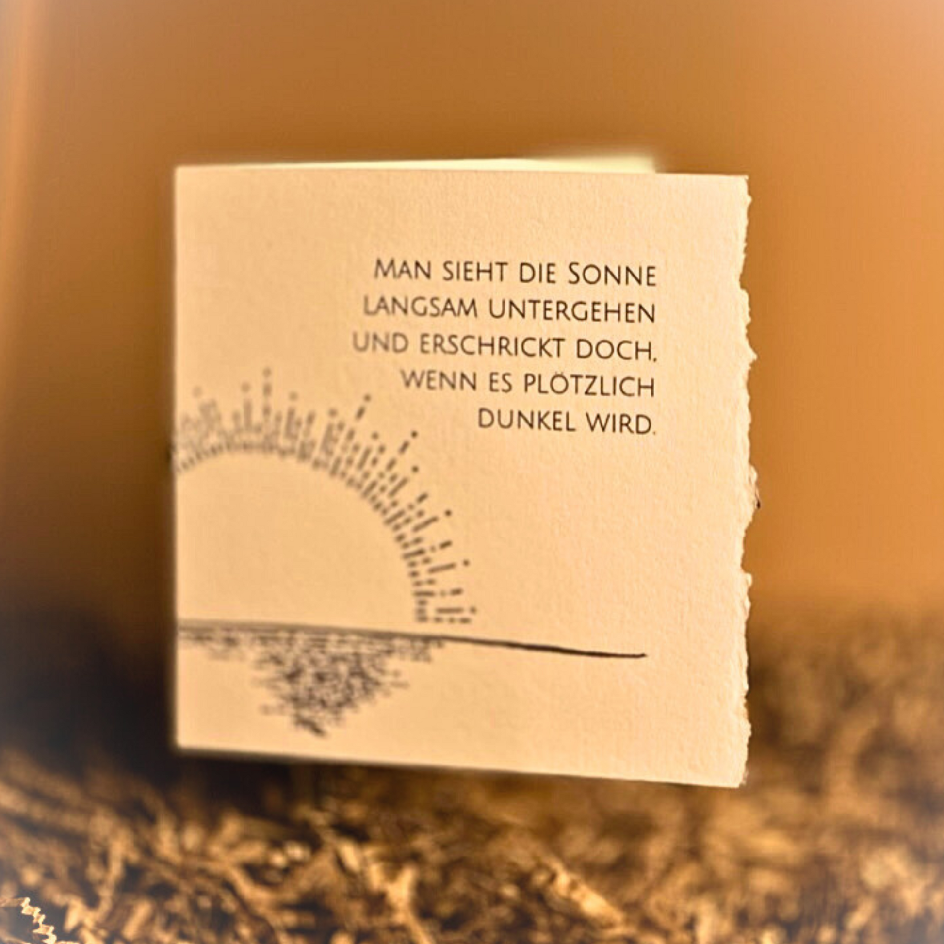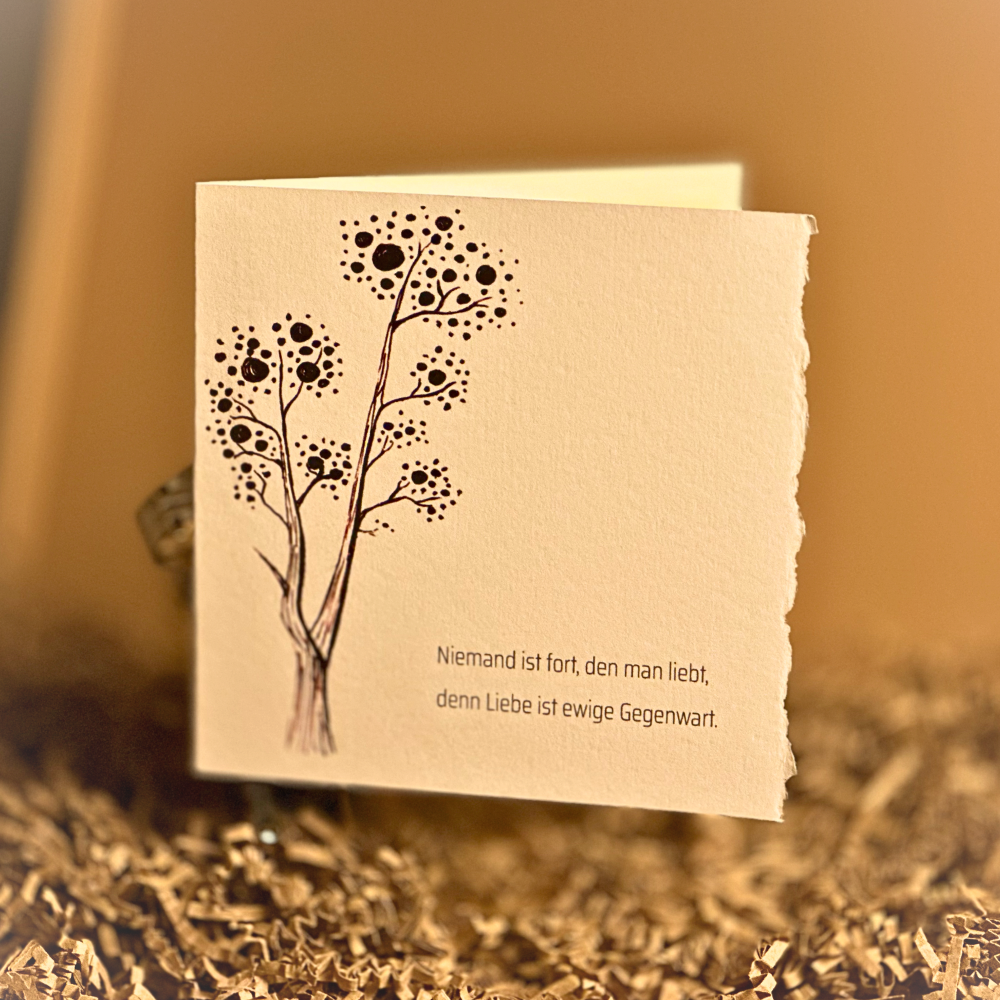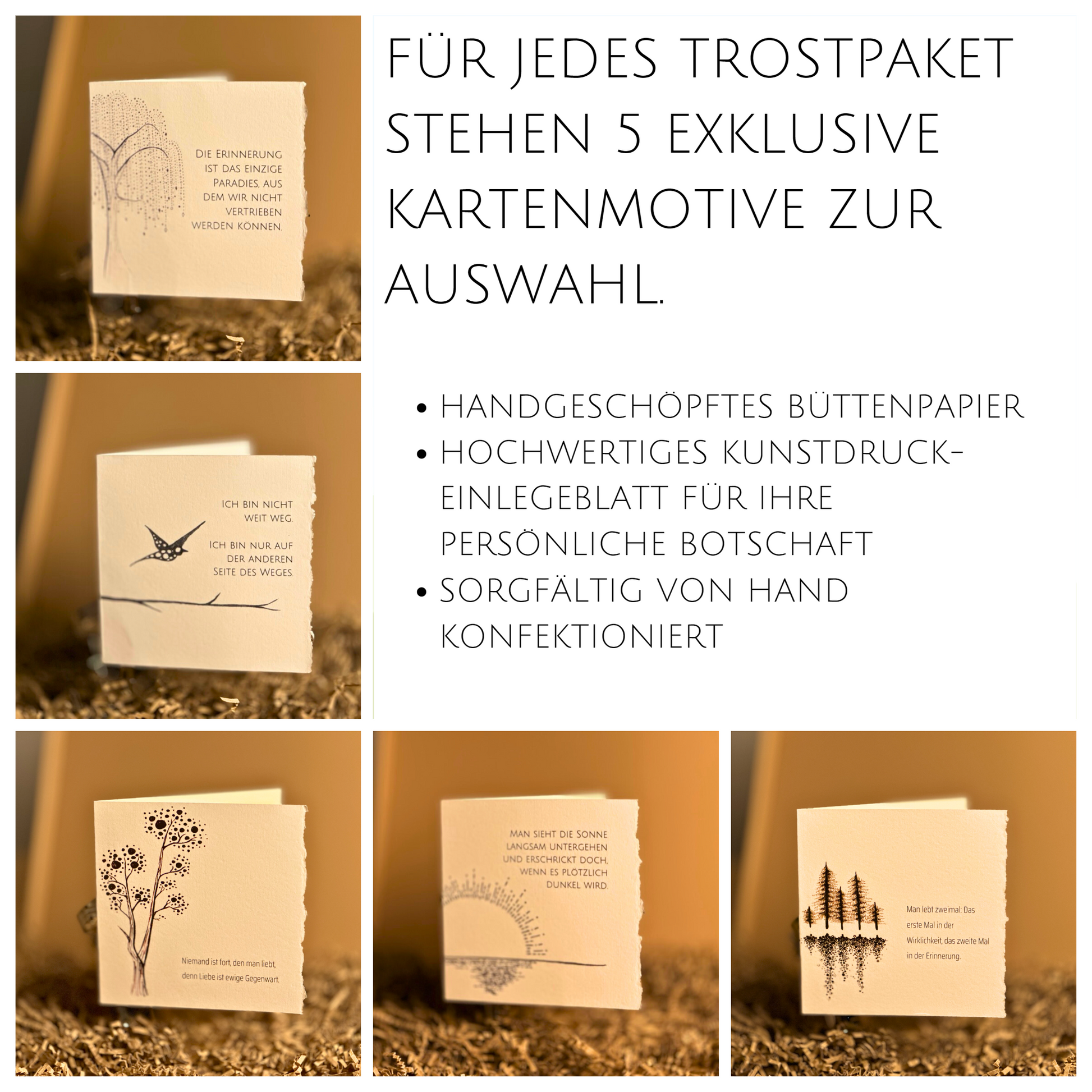 Die Produktverpackung wird mit dem Namen der Person individualisiert. Trostkarten mit fünf exklusiven Motiven stehen zur Auswahl und bieten Platz für eine persönliche Botschaft an den/ die Trauernden.