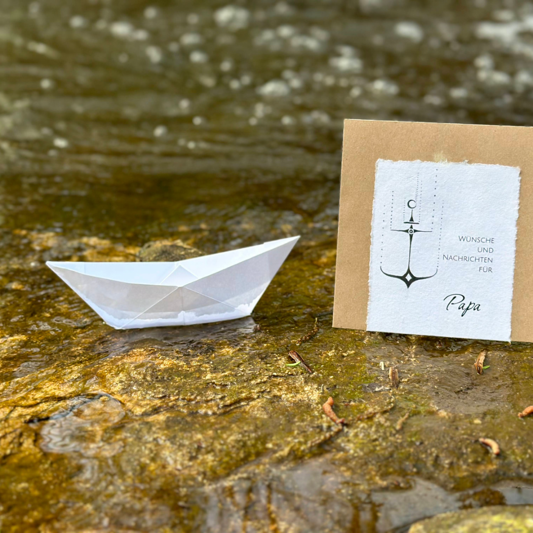 *Für all die Menschen, die eher dem Wasser zugetan sind eröffnet dieses Spezialpapier die Möglichkeit, einen Wunsch oder eine Botschaft aufzuschreiben, es zu einem kleinen Schiffchen zu falten und diese Botschaft dann dem Wasser zu übergeben. Und während man noch einmal an den lieben Menschen denkt, versinkt es in den Fluten und zerfällt in wenigen Augenblicken vollständig in seine natürlichen Zellulosefasern.